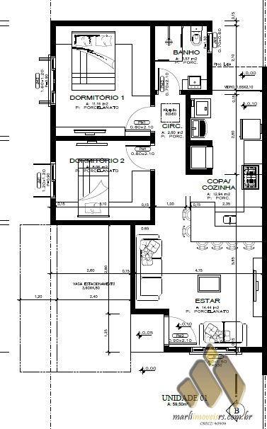 Esquadrias em alumínio, porcelanato na área social, laminado na área íntima.