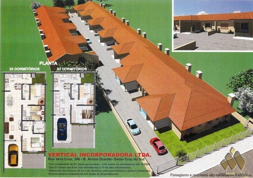 Geminadas de 2 dorm, sala estar/jantar, cozinha, banheiro, área de serviço, abrigo para carro mais vaga de estacionamento. Com churrasqueira. Piso porcelanato, forro em laje. Aberturas em madeira de lei e alumínio anodizado.