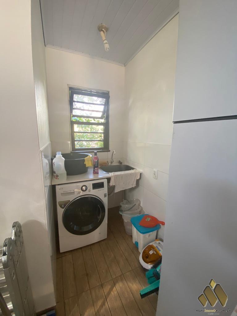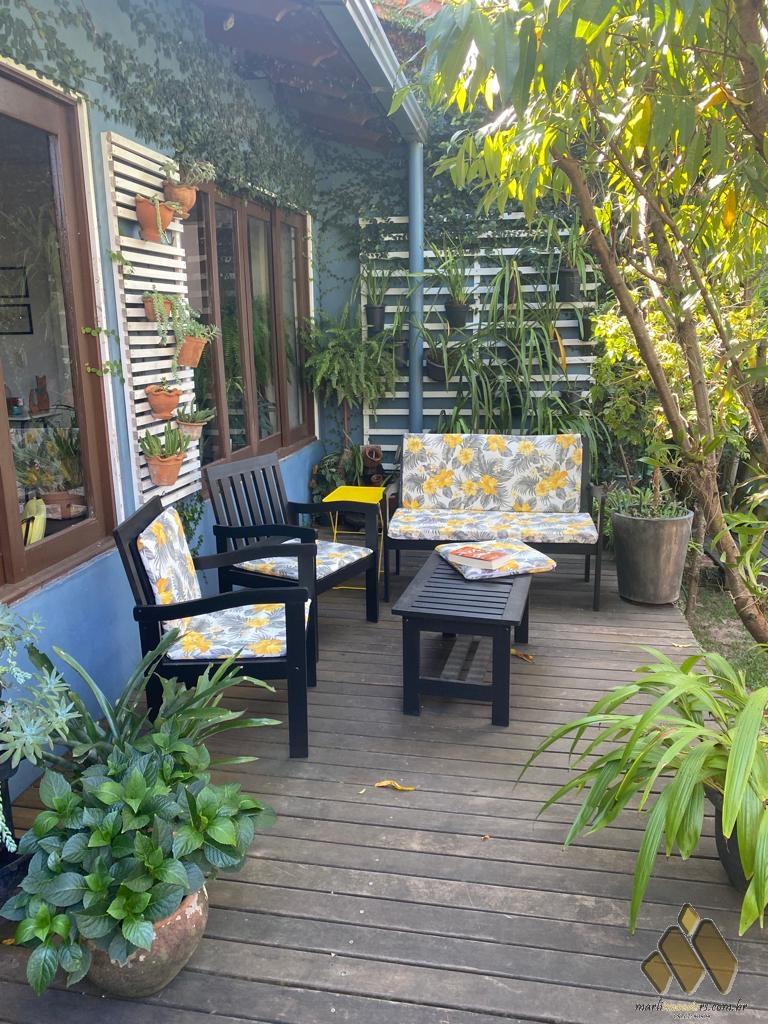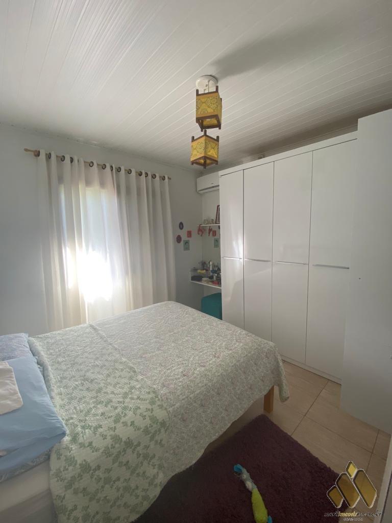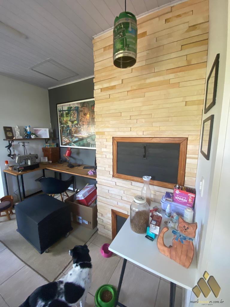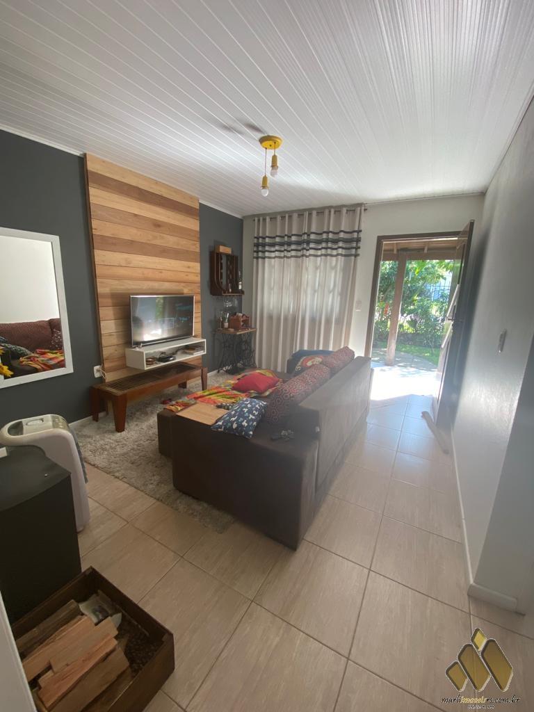 2 dorm, sendo um com móveis projetados, sala de estar/jantar com lareira, cozinha com móveis projetados, área com churrasqueira e fogão a lenha, lavabo, banheiro, lavanderia, pátio com árvores frutíferas e diversas plantas.