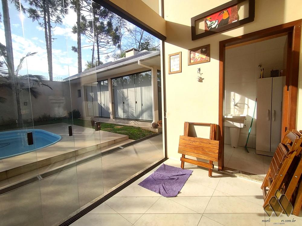 Linda alvenaria em ótima localização, completa para você e sua família. São 3 dormitórios, sendo uma suíte, sala de estar com lareira, sala de jantar, cozinha com móveis projetados e bancada em granito, espaço gourmet com churrasqueira e pia em granito, quiosque com churrasqueira e lavabo, piscina com cascata, lavanderia, banheiro privativo, depósito, garagem para dois carros, amplo pátio frente e fundos todo murado e gradeado.