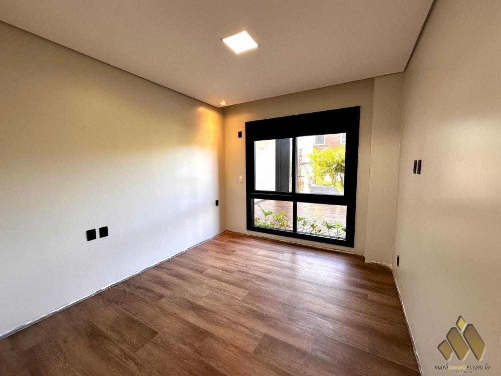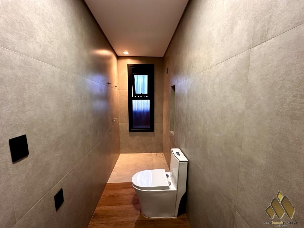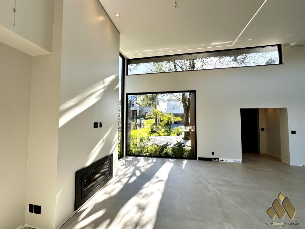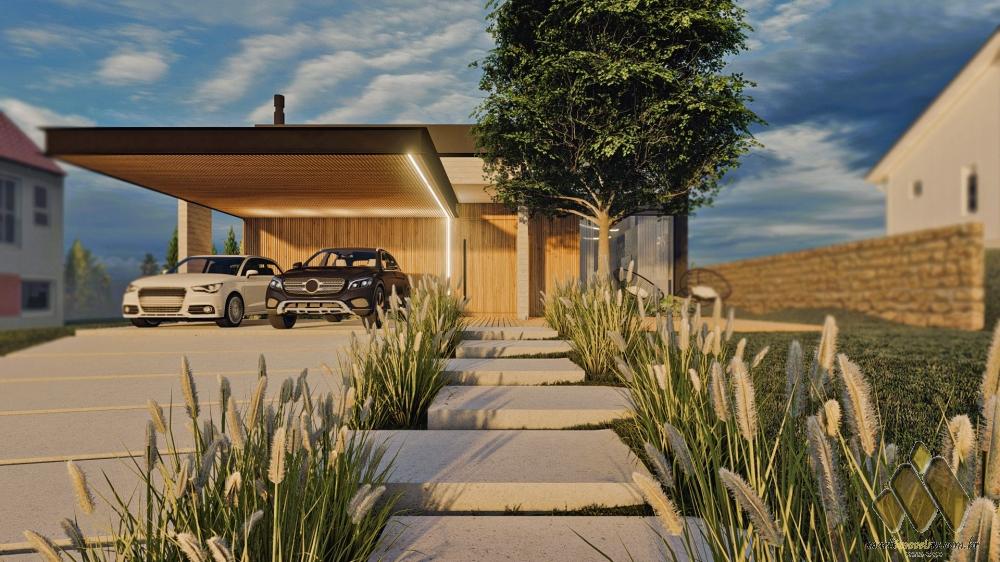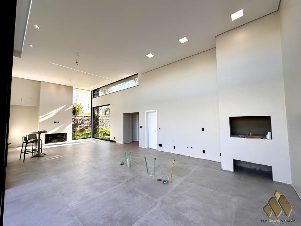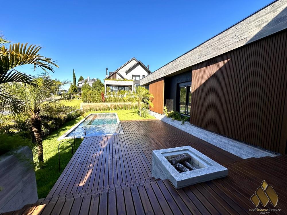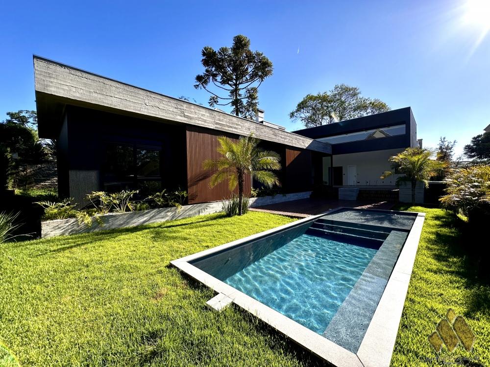 Alvenaria térrea em condomínio fechado, com 3 suítes, sendo uma master com closet e lavatórios separados, ampla sala de estar/jantar integrada com a cozinha, home office, lavanderia, lavabo, garagem dois carros. Amplo pátio com paisagismo integrado, piscina de concreto, amplo deck de madeira com fireplace central.