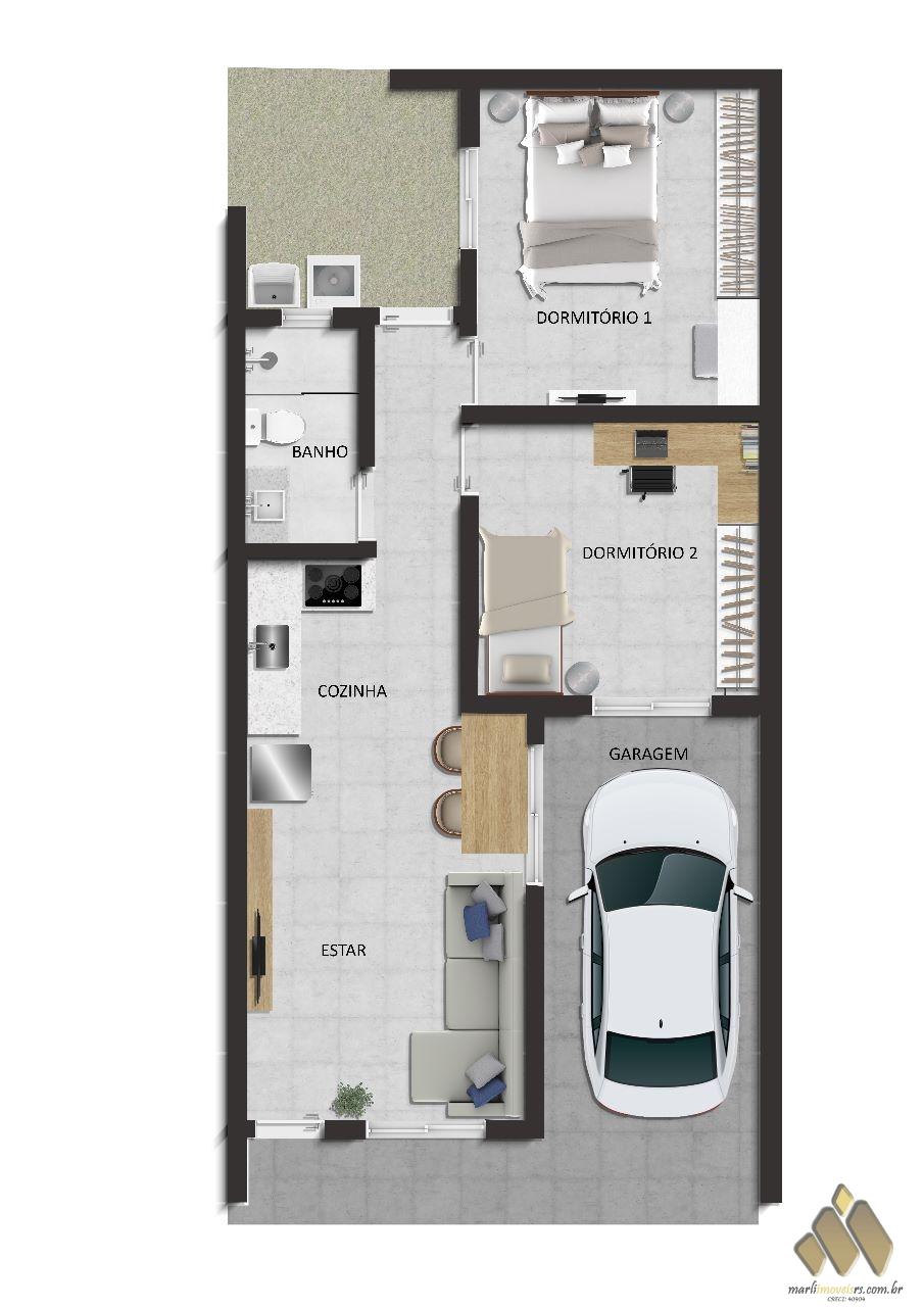 2 dormitórios, sala/cozinha, banheiro, área de serviço, vaga estacionamento.